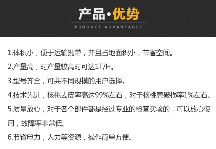 2、本設備脫凈率高于99%,核桃殼破損率小于0.5%。適用于小型加工企業或核桃加工經營商戶。